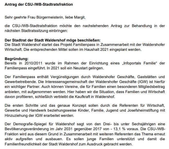 Auf Antrag der CSU-/WB-Stadtratsfraktion wird der bereits im Jahr 2010/2011 eingeführte Familienpass nun wieder reaktiviert, da er zwischenzeitlich eingeschlafen und nicht mehr aktuell war. In Zusammenarbeit mit dem Waldershofer Handel,…