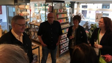 Reinhard Zeus zeigte sich dankbar für den Besuch der örtlichen Politik und freut sich über das Interesse. „Heartware“ gibt es nun seit zehn Jahren, schon die Namensfindung war eine kreative Aufgabe, bringt aber das gut zum Ausdruck, was sie anbieten wollen: Ware, die zu Herzen geht. Die Gründung des Geschäftes sei damals fast spontan entstanden, als man den Leerstand gegenüber des Brauhauses sah. Mit viel Einsatz, Erfahrung und Idealismus habe man das aufgebaut, was heute zu sehen ist.